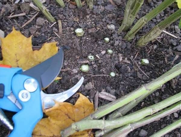 Осенью лучше пересаживать крупные деленки, потому что они легче переносят заморозки и хорошо укореняются. Надо также обеспечить перевалку цветов, выращенных летом из весенних черенков. У высаживаемой делянки должно быть не менее двух стеблей, их обрезают, оставив пеньки с высотой до 20 см, у основания пенька должны быть почки.