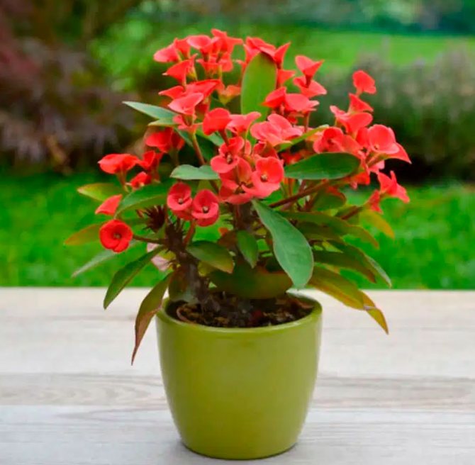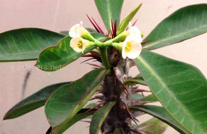При таком уходе молочай начинает цвести уже к концу первого года жизни. Правда, цветки у него невзрачные. Зато образуется такое количество семян, что отпадает всякая необходимость в специальном размножении этого вида. Созревшие семена самостоятельно расселяются по всем соседним цветочным горшкам, которые стоят поблизости на подоконнике.
