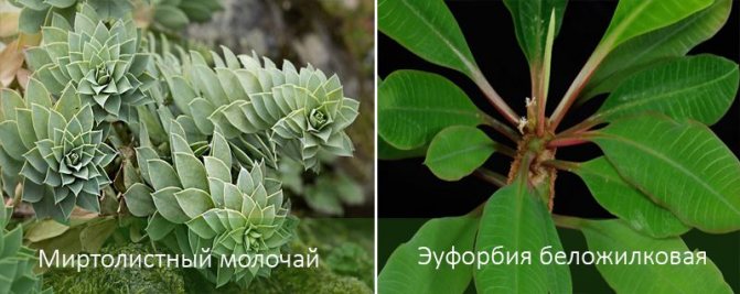 Миртолистный молочай – невысокая до 25 сантиметров кустарниковая флора со стелющимися стеблями. Густо усеян небольшими от 1,5 до 3 см длиной двоякими листьями ромбовидной формы, серо-голубого цвета. Цветет дважды в год – в апреле и июле небольшими (до 1,5 см в диаметре) бледно-желтыми цветкам.