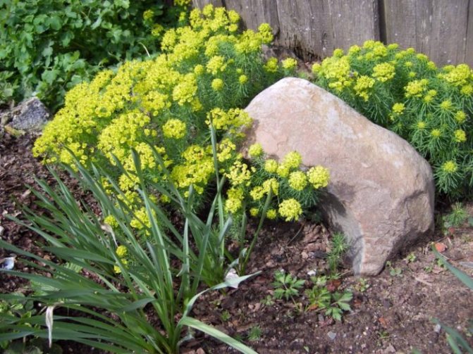 Обратите внимание! Прекрасные соседи для эуфорбии – миниатюрные хвойники, можжевельники, ясколка, а также нарциссы и тюльпаны, незабудки и ирисы, плетистые розы.