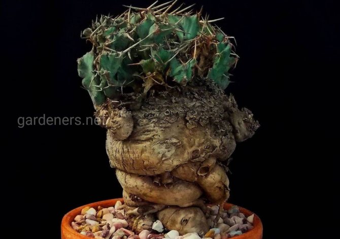 Как становится понятно из названия, данный суккулент имеет отличительную корневую систему. Однако мало кто знает, что крупные корни — это видоизмененный модифицированный ствол, на конце которого формируются ветки, окрашенные в светло-зеленый цвет с белым узором. Ветки состоят из трех-четырех ребер, которые разделены между собой на сегменты, имеющие глубокие борозды. Края ребер украшают бугорки среднего размера, на концах которых держатся парные иголки. Ребра имеют волнистую форму и роговые края серого окраса. Листья рудиментарные, зелёные. Из-за внешнего вида данный молочай часто используется в качестве бонсая, как украшение, выставленное на отдельных столах. Растение относится к неприхотливым в выращивании, нуждается в редких поливах и рассеянном освещении. Размножается отростками или семенами.