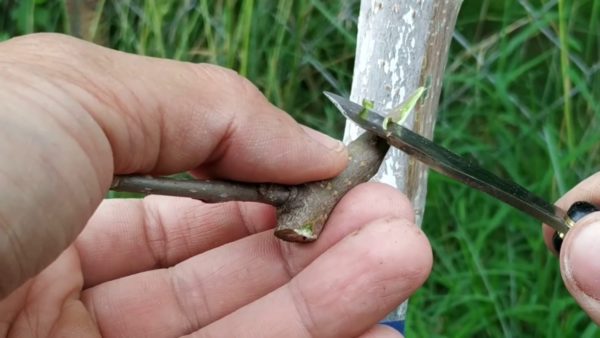 Для проведения процедуры берут вызревшую одиночную почку прошлогоднего зрелого побега. Его срезают предварительно, осенью предыдущего сезона (или в конце февраля). Зрелость стебля определяют с помощью сгибания. Если слышится потрескивания – побег зрелый.